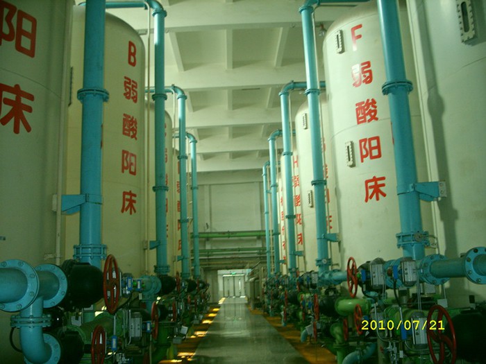 鋼襯膠混床,正常工作時(shí),陰陽(yáng)離子樹脂按一定比例合在一起進(jìn)一步去除水中溶解性離子,設(shè)計(jì)不同組合其出水電導(dǎo)可達(dá)到1~18M-cm 。均勻混合的樹脂層中,陽(yáng)樹脂與陰樹脂緊密地交錯(cuò)排列,每一對(duì)陽(yáng)樹脂與陰樹脂顆粒似于一組復(fù)床,混床就象無數(shù)組串聯(lián)運(yùn)行的復(fù)床。通過混合離子交換后進(jìn)入水中的氫離子與氫氧離子會(huì)立即生成電離度很低的水分子(H2O),很少可能形成陽(yáng)離子或陰離子交換時(shí)的反離子,因而能制取純度相當(dāng)高的成品水。